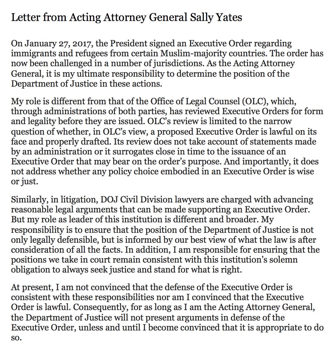 Before I could finish and post this, I read this: "Trump fires acting U.S. attorney general after she refuses to enforce immigration order". So much for that. But this is what needs to happen. Remember this woman for her act of conscience. Congratulations to you, Sally Yates. There will be a better job for you somewhere.